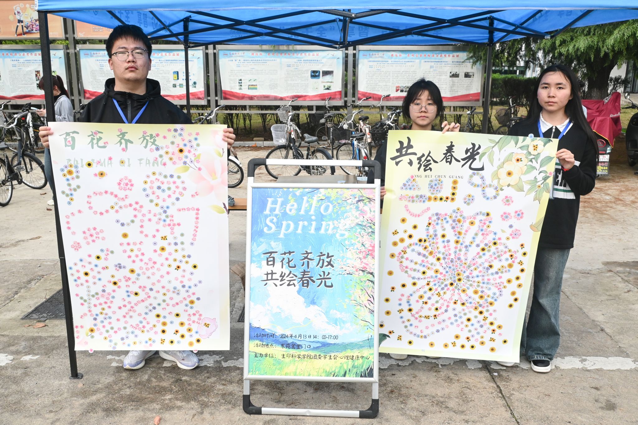 4 月 13 日,必赢线路检测3003no1心理健康工作站在东苑食堂门口开展“百花齐放,共绘春光 ” 拼贴画活动,学生们用一张张精美的花卉贴纸,在展板上“复刻 ”春日花开千万朵的美丽景象。